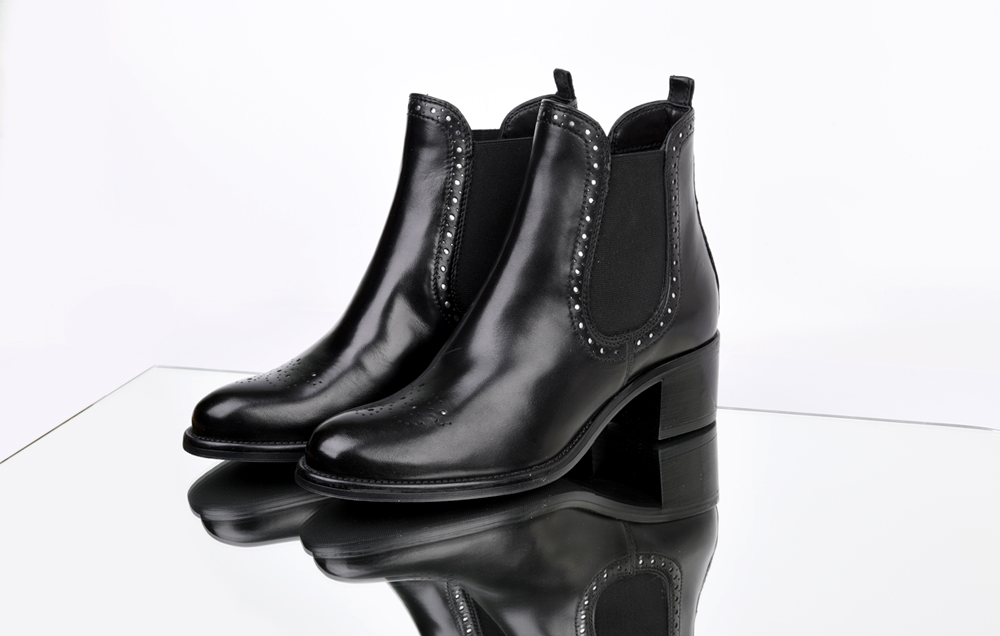 Не обошлось и без английской классики — челси. Дизайнеры использовали блестящую натуральную матовую кожу, при одном взгляде на которую убеждаешься в её подлинности. Классическая расцветка, оригинальные решения декора — черная модель украшена изящной перфорацией на мысе, брогированием по канту и контуру резинки — всё это придаёт ботинкам идеального силуэта эксклюзивную утонченность.